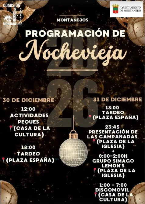 - Nochevieja en la Plaza de la Iglesia: vive la tradición de tomar las uvas al son de las campanas en directo. A continuación, el Grupo Simago nos hará dar los primeros bailoteos de la noche.